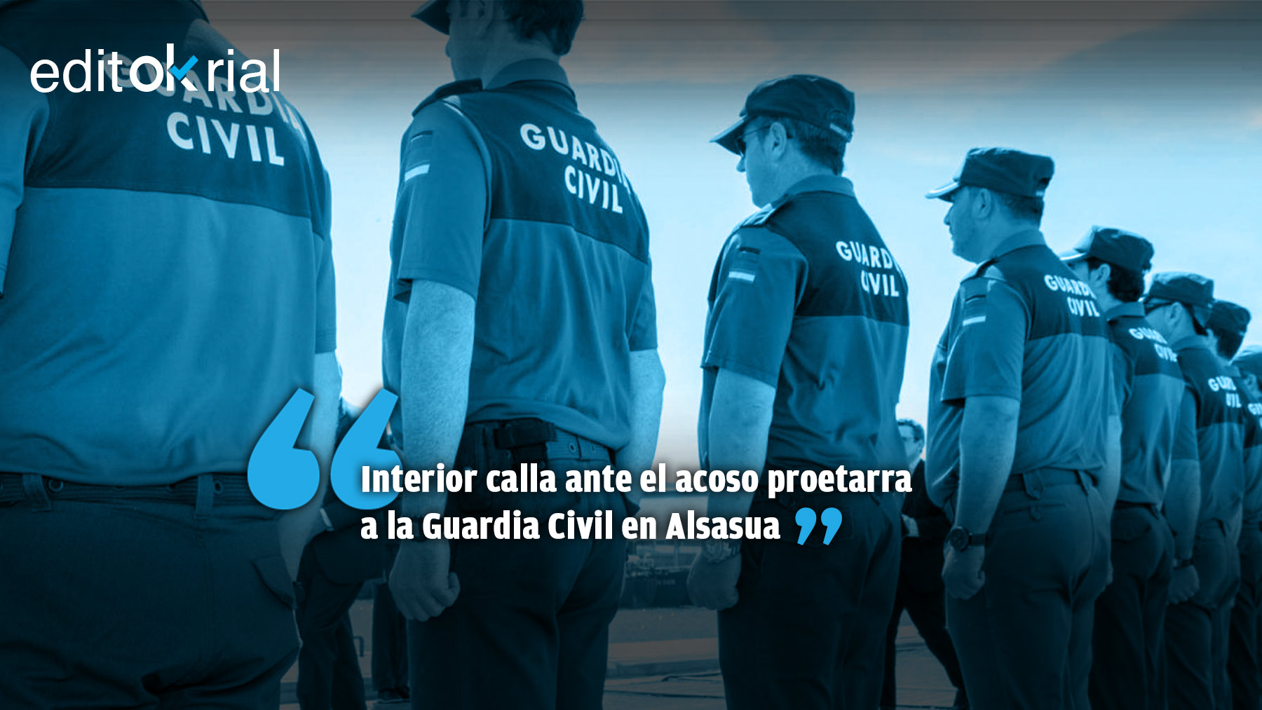 Lo del Ministerio del Interior de Fernando Grande-Marlaska es una ignominia. El pasado 3 de septiembre, los guardias civiles desplegados en Alsasua en la marcha Ospa Eguna (Día del adiós) convocada por los proetarras fueron recibidos al grito de «¡asesinos!» y expresiones del tipo ««Esos de ahí enfrente, torturan a la gente» o «Perros guardianes del orden y la Ley, asesinos a sueldo». Sin embargo, el Ministerio de Interior, que llegó a convocar una reunión de su Oficina contra los Delitos de Odio con presencia del propio presidente del Gobierno, Pedro Sánchez, y de Marlaska por una falsa denuncia homófoba en septiembre de 2021, se ha puesto de canto -lo que supone ponerse del lado de los proetarras- y permanece de brazos cruzados ante este evidente acto de humillación, acoso y ataque a la Benemérita.
