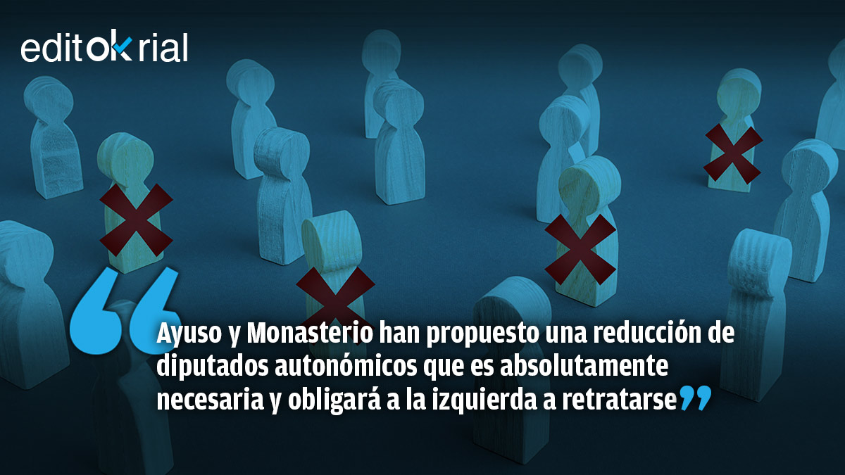 El acuerdo entre PP y Vox para una reducción de diputados en la Asamblea de Madrid -pasaría de los 136 actuales a un número que oscilaría entre los 69 y los 101- es una medida que redundaría en un ahorro considerable (3 millones de euros anuales si finalmente fueran 69) y trasladaría un mensaje nítido de austeridad. En la actualidad, el número de diputados viene determinado en función de la población, pero la eficacia en la gestión no puede vincularse, en ningún caso, al número de habitantes, de modo que es perfectamente posible que el ejercicio de la labor legislativa y de control al Gobierno pueda llevarse a cabo con un un número sensiblemente inferior de parlamentarios. Es más, el número actual -136- tiende irremediablemente a duplicar funciones que bien podrían acometerse con menos diputados.