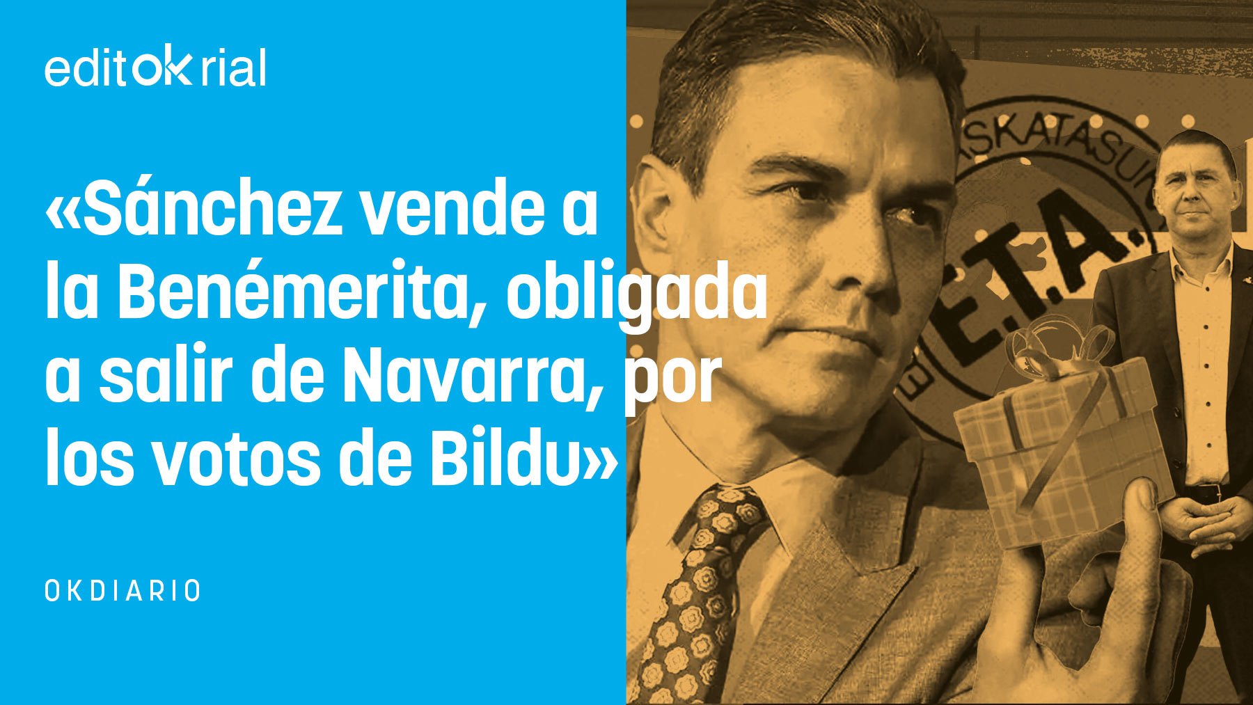 La ignominia alcanza dimensiones colosales: Pedro Sánchez se ha rendido al chantaje de los herederos de una banda de asesinos y ha cedido a la exigencia de Bildu para que los 220 agentes de la Guardia Civil del Sector de Tráfico de Navarra dejen de prestar sus servicios. Estamos ante una auténtica traición a un Cuerpo que sufrió en sus carnes la violencia asesina de ETA. Aquella frase de de la madre de Joseba Pagazaurtundua a Patxi López, «harás muchas más cosas que me helarán la sangre», cobra de nuevo actualidad al comprobar el grado de cobardía moral de un presidente del Gobierno que ha profanado la memoria de las víctimas al alcanzar un pacto obsceno con los filoetarras. Pero la afrenta a la Benemérita no se queda ahí, sino que Bildu también ha vetado que los guardias civiles puedan incorporarse en la Policía Foral.