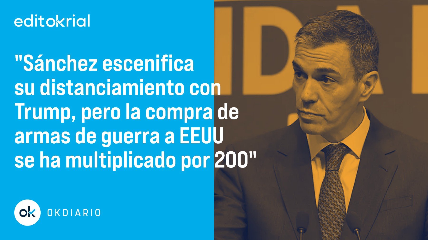 Sanchismo puro. De cara a la galería, Trump es malísimo, pero compramos armas como nunca a Estados Unidos. Por tanto, menos lobos. La factoría de propaganda de Moncloa puede vender que el Gobierno de España no se pliega a la Administración de EEUU, pero los datos —que es lo que cuenta— demuestran que todo es puro teatro. Por cierto, estos datos que hoy publica OKDIARIO los conocen —o deberían conocerlos— los socios a la izquierda del PSOE. Pero callan.