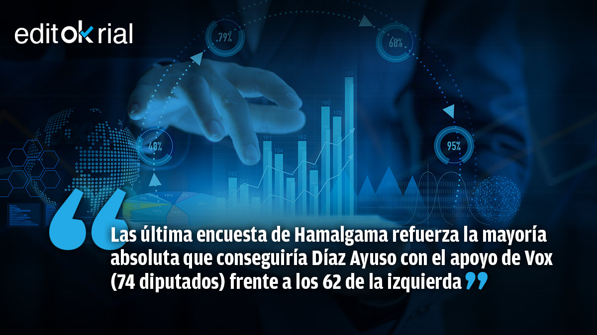 En conclusión: Ayuso sigue creciendo entre sondeo y sondeo, Vox hace lo propio y todos los intentos de Sánchez, Iglesias y Tezanos por invertir el curso de las tendencias se estrellan contra la realidad. Es verdad que la encuesta de Hamalgama no deja de ser una encuesta. Lo que no es poca cosa. Las del CIS dejaron de serlo cuando el socialcomunismo llegó a La Moncloa.