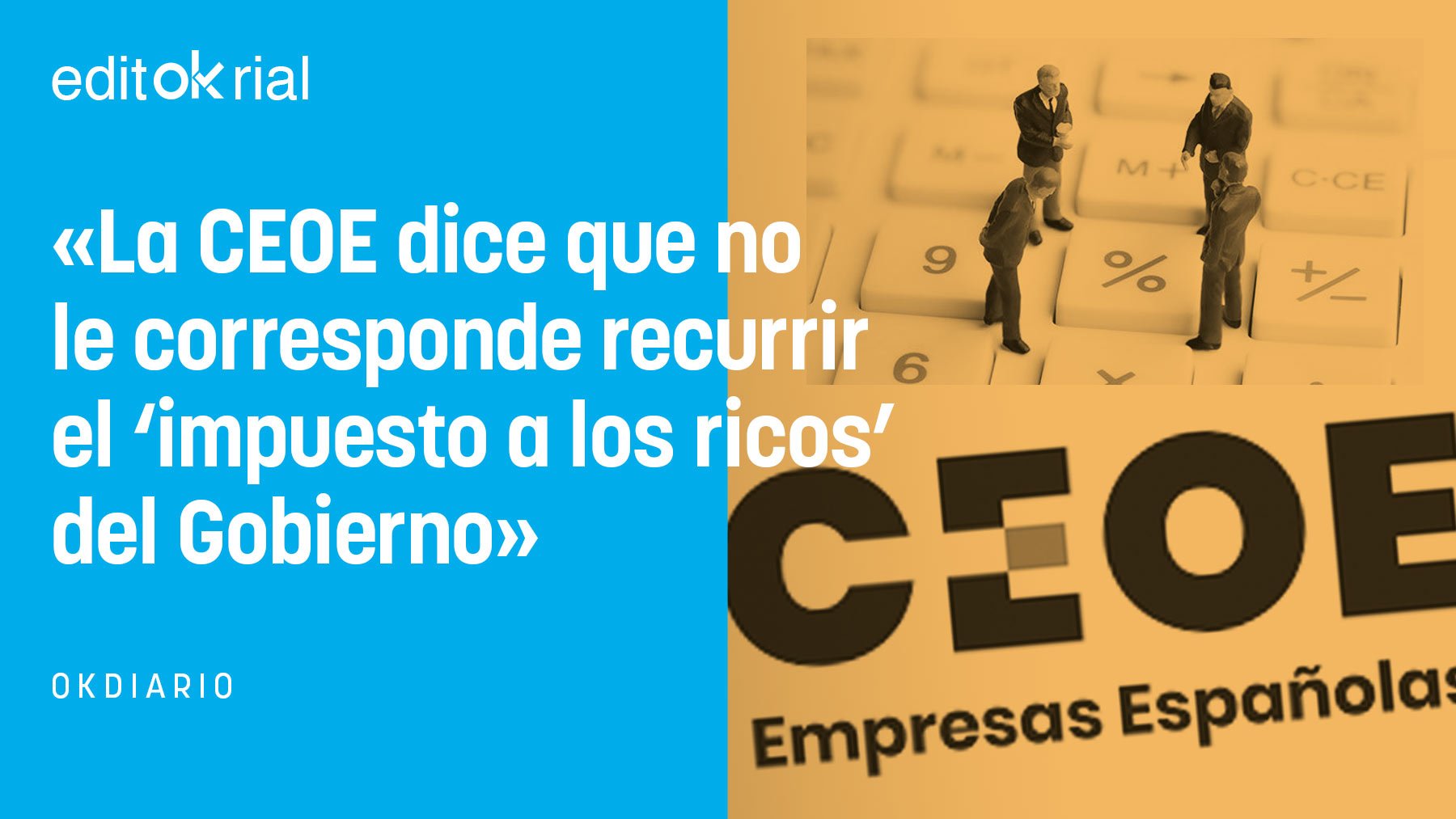 La CEOE no acompañará a Josep Sánchez Llibre, presidente de Foment del Treball, en el recurso que ha anunciado ante el Tribunal Constitucional para tratar de frenar el impuesto a los ricos aprobado por el Gobierno de Pedro Sánchez. «Los empresarios, la patronal, no está para recurrir esta clase de impuestos», explican fuentes de la organización que preside Antonio Garamendi. En su derecho está el acudir o no al TC y ellos sabrán, pero lo que resulta sorprendente es su justificación. ¿Qué es eso de que la CEOE no está para recurrir a los tribunales decisiones del Gobierno? Caramba, ¿y sí lo estaba para que su presidente apoyara la decisión del Ejecutivo socialcomunista de indultar a los golpistas catalanes?