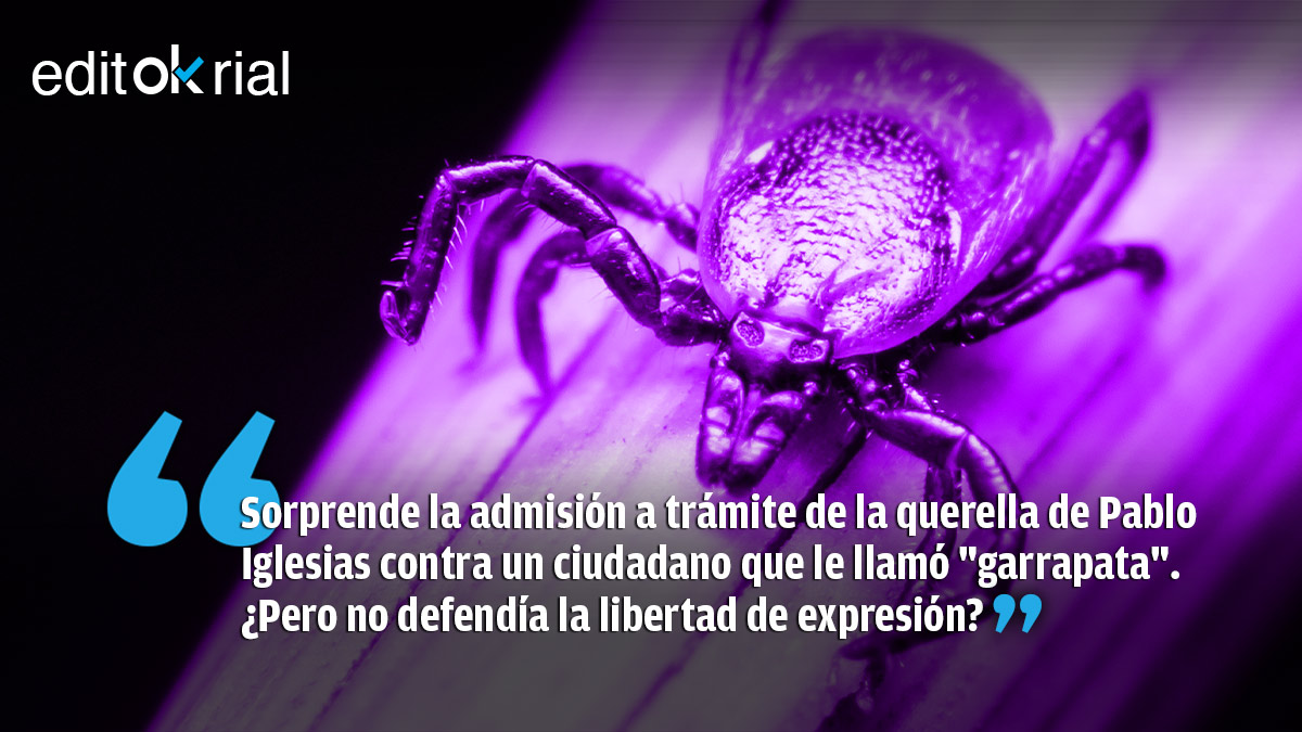 La querella de la Fiscalía y de Pablo Iglesias contra el ciudadano Miguel Frontera, vecino de Galapagar al que el Ministerio Público y el vicepresidente segundo quieren meter en la cárcel por manifestarse frente al casoplón y llamarle «garrapata», no se tiene en pie, como tampoco se entiende que el juez la haya admitido a trámite. Es sencillamente surrealista, un monumento a la hipocresía, que el vicepresidente segundo del Gobierno pida derogar el delito de injurias contra la Corona para sacar de la cárcel a un rapero condenado, además, por enaltecimiento del terrorismo con el argumento de que sus calumnias son «libertad de expresión» y pretenda meter en la cárcel a un ciudadano que le llamó «chepas». Y dado que la Fiscalía depende del Gobierno no sorprende, aunque resulte alucinante, que salga en apoyo del vicepresidente segundo del Gobierno. Extraña, eso sí, que el juez haya admitido a trámite la querella. ¿Es que no tiene nada mejor que hacer su señoría?