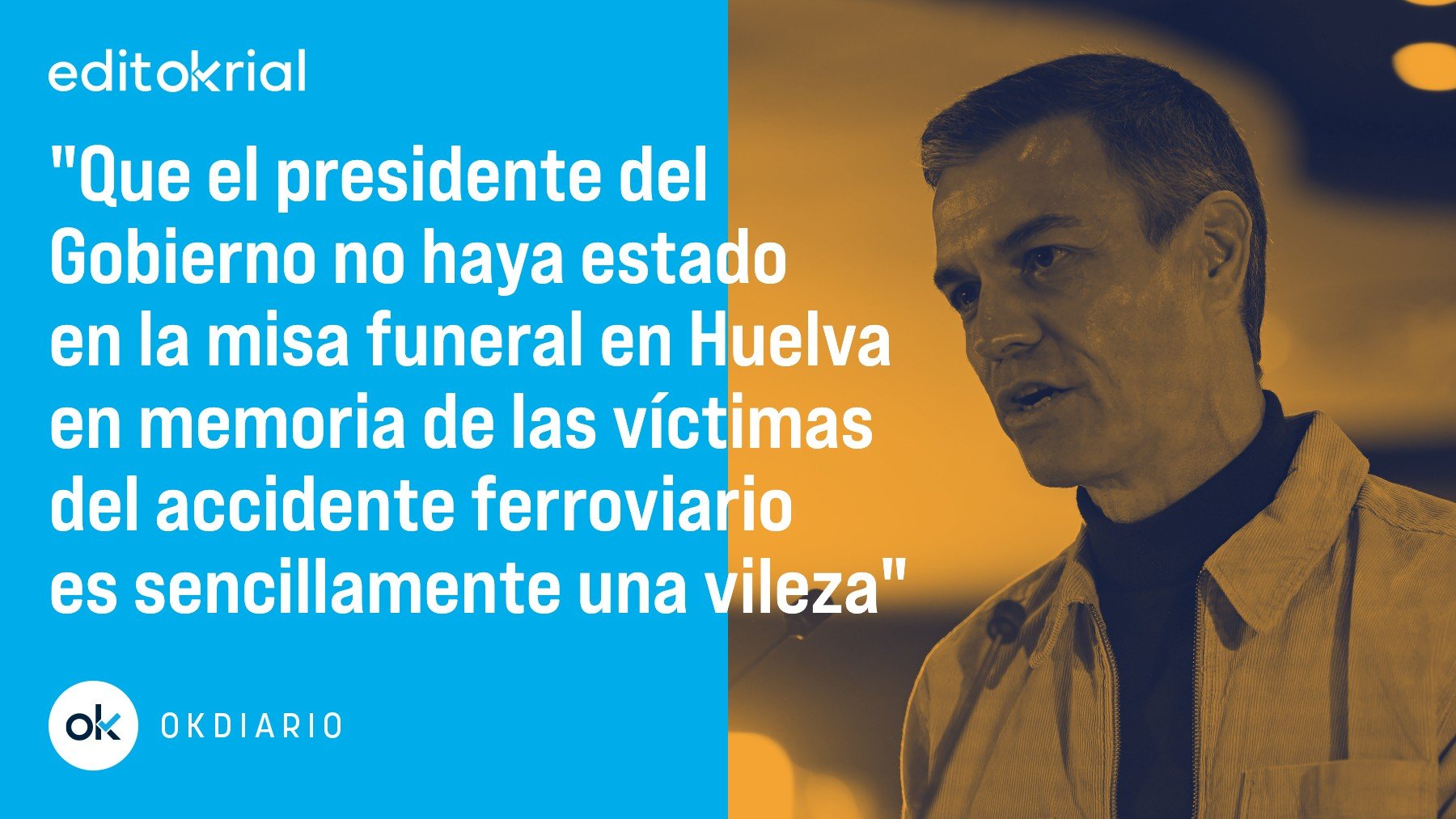 A estas alturas que el jefe del Ejecutivo se excuse en motivos como ese lo que viene a reafirmar es su probada indignidad, su bajeza moral y su profunda cobardía, porque si ha habido miembros del Gobierno en el funeral de Huelva –de carácter religioso y a mucha honra– nadie mejor que Pedro Sánchez para representar al Ejecutivo. Por razones obvias. Han estado presentes, además de los familiares de las víctimas, los Reyes; el presidente de la Junta de Andalucía, Juanma Moreno; el presidente del PP, Alberto Núñez Feijóo, y el alcalde de Adamuz, José Vilaplana, entre otros. Y ha faltado Pedro Sánchez, una ausencia fruto –que nadie se engañe– de una insufrible vileza, porque hay que ser profundamente indigno para que la cabeza del Gobierno de España no esté acompañando en su dolor a quienes han sufrido en sus carnes tan terrible experiencia. Tampoco ha estado el ministro de Transportes, Óscar Puente, al que habría que reprocharle su falta de valor para estar donde tenía que estar también por razones obvias. Acompañar al pueblo, sentir su latido, es una obligación indelegable que compete a quien ostenta la más alta responsabilidad de Gobierno. En un funeral religioso en Huelva o donde toque. Miserables.