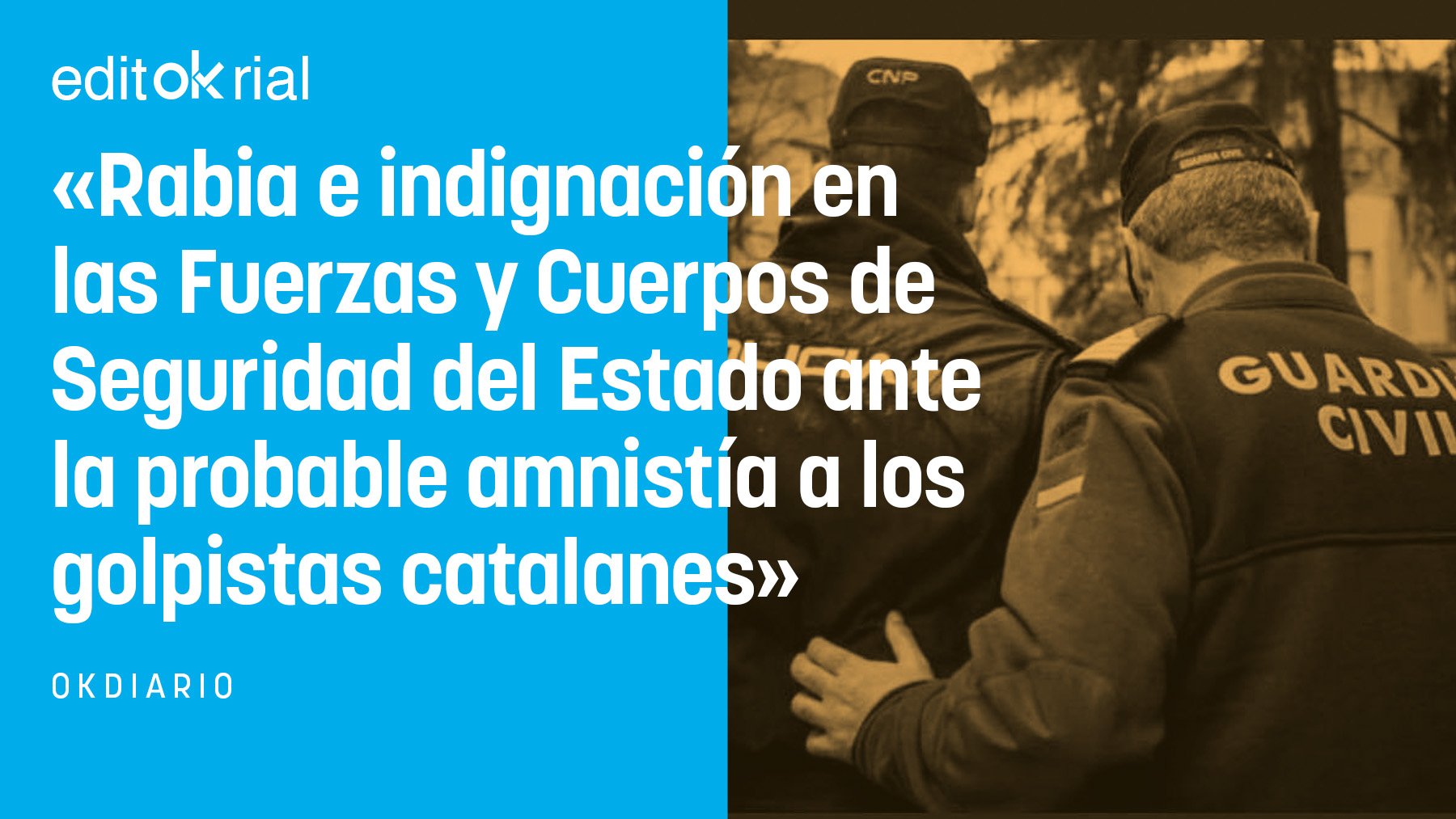 Asociaciones de policías y de guardias civiles -quienes tienen que velar por el cumplimiento de la ley en virtud de los principios constitucionales y garantizar la seguridad pública- han expresado su rotundo rechazo a la ley de amnistía que Pedro Sánchez pretende impulsar para garantizarse los votos de los golpistas que subvirtieron el orden constitucional, al considerar que supone un menosprecio intolerable a quienes en nombre del Estado intervinieron el 1-O en Cataluña «en defensa de la Constitución y la unidad de España» frente al desafío de los separatistas.