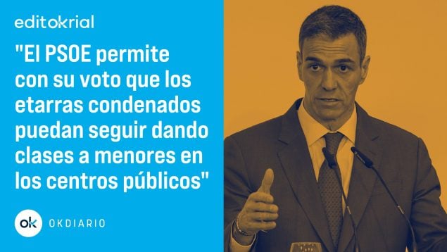 El PSOE ya no disimula y se pone del lado de los terroristas, avalando con su voto que los etarras condenados puedan seguir dando clases a menores de edad, una realidad que en algunos casos alcanza tintes obscenos al impartir lecciones de Ética. El no va más de la ignominia. UPN presentó una proposición de ley para introducir un nuevo requisito en el Estatuto del Empleado Público y modificar la ley general de subvenciones con el fin de «impedir que condenados por el terrorismo puedan trabajar con menores». Su argumento es elemental, pura lógica: si un agresor sexual o un maltratador no pueden hacerlo, tampoco un terrorista. Pero es que, además, los terroristas que imparten clases no desaprovechan la ocasión de adoctrinar a los alumnos. Es sencillo: quien ha sido condenado por delitos de terrorismo no puede practicar la docencia, por razones obvias. Pues bien, los socialistas han impedido con su voto que la propuesta saliera adelante, de modo que los terroristas podrán seguir dando clases de Ética, como ocurrió en un instituto de Elgoibar donde un etarra daba lecciones a niños de entre 12 y 16 años.