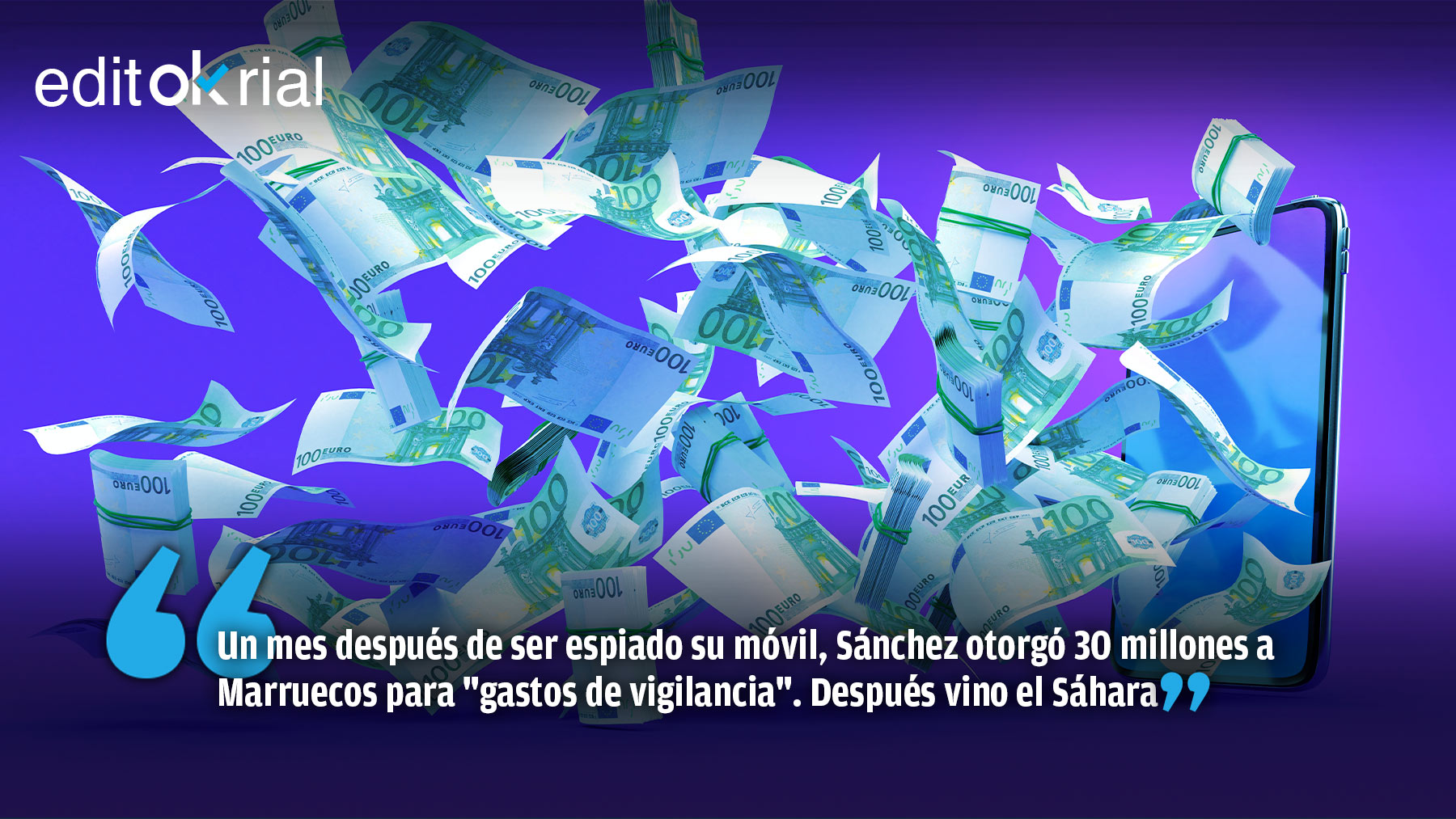 El 19 de mayo de 2021, el software espía Pegasus se activó por primera vez en el teléfono del presidente del Gobierno. Las sospechas se centran en Marruecos, que menos de un mes después era obsequiado con una línea de crédito de 30 millones para material de vigilancia para luchar contra la inmigración ilegal. No es descabellado plantear la siguiente hipótesis: si Marruecos conoció información relevante y comprometida de Pedro Sánchez, bien pudo ponerle precio a la misma. Primero, 30 millones de euros y una actitud de sumisión a Rabat incomprensible en un momento en que las autoridades de Marruecos agitaron e instaron la invasión de Ceuta. Lo que vino después ya fue un triple salto mortal, porque de manera unilateral y rompiendo décadas de consenso en política exterior, Sánchez regaló a Marruecos el Sáhara, al apoyar su propuesta sobre este territorio. Entre la casualidad y la causalidad, conociendo cómo se las gasta Pedro Sánchez, lo más lógico es barajar la sospecha de que el Sáhara y 30 millones de euros han podido ser el precio que el Gobierno ha pagado por la información robada.