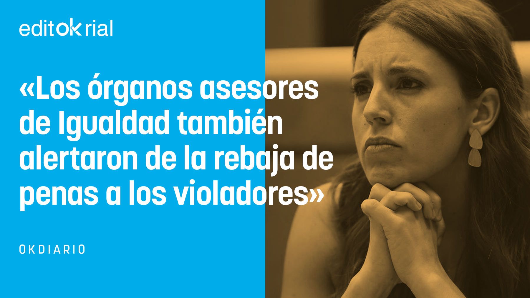Ahora resulta que lo sabían todos. El Gobierno, los órganos asesores del Ministerio de Igualdad y hasta el último mindundi. O sea, que era un clamor generalizado que la norma promovida por Irene Montero y que fue bautizada con el nombre de ley del sólo sí es sí iba a provocar la rebaja de penas a violadores o su puesta en libertad. Si OKDIARIO desvelaba ayer el informe de Presidencia en el que se alertaba del riesgo de que la ley favoreciera a los agresores sexuales que cumplían prisión, hoy este diario les aporta otro documento clave, el elaborado por el Consejo de Participación de la Mujer, órgano consultivo y asesor adscrito al Ministerio de Igualdad, que está firmado por la Secretaría de Estado de Igualdad y el Instituto de las Mujeres, en el que se afirma con toda rotundidad que «debería revisarse la rebaja de las penas de los delitos de agresión sexual en los artículos 178, 179 y 180 del Código Penal». Asimismo, la Asociación de Mujeres Juristas Themis fue contundente al asegurar que «mostramos nuestro desacuerdo en la rebaja generalizada de penas para los delitos contra la libertad sexual», porque «aunque ahora se haya eliminado el delito de abuso sexual y haya que reorganizar las penas y se contemplen agravantes, que antes también existían, en la práctica, casi con total seguridad, la reforma va a suponer una imposición más leve de penas por parte de los juzgados y tribunales».