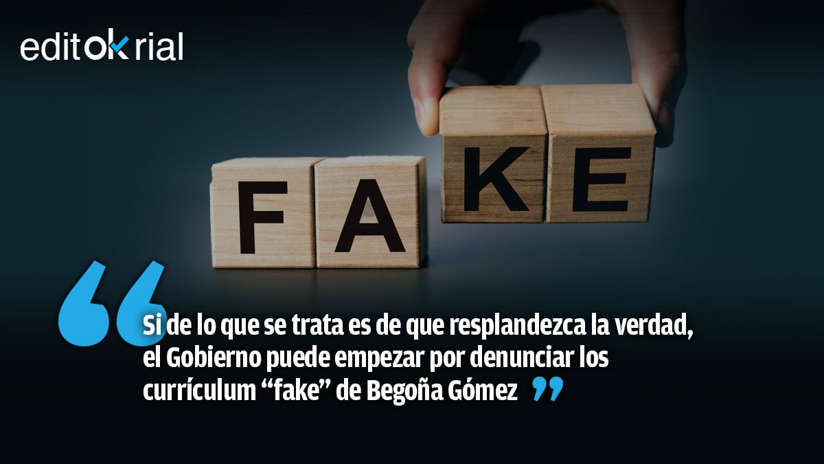 Para informaciones fake, las de la mujer del presidente, que ha adornado su currículum con licenciaturas más falsas que un billete de euro. En lugar de tratar de amordazar a la prensa, la comisión contra la desinformación promovida por Pedro Sánchez -el ‘Ministerio de la Verdad’- debería empezar por la propia casa del presidente del Gobierno. Por ejemplo, por su mujer. Ahí tiene trabajo.