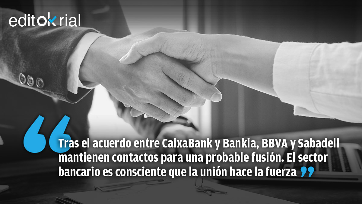La reducción de costes es condición necesaria para que la banca pueda ser rentable, de modo que que la fusión de CaixaBank y Bankia, más el probable matrimonio entre BBVA y Sabadell, abre de par en par las puertas a un escenario en que las fusiones, incluso las transfronterizas -mucho más complejas- marcaran la «nueva normalidad» de un sector que busca la solvencia por la vía de la unión. El objetivo es alcanzar un sistema financiero sólido, capaz de resistir las turbulencias y marejadas de un mercado regido por la más absoluta incertidumbre. La crisis del coronavirus ha precipitado los movimientos en un sector, el bancario, que ha interiorizado que la unión hace la fuerza.