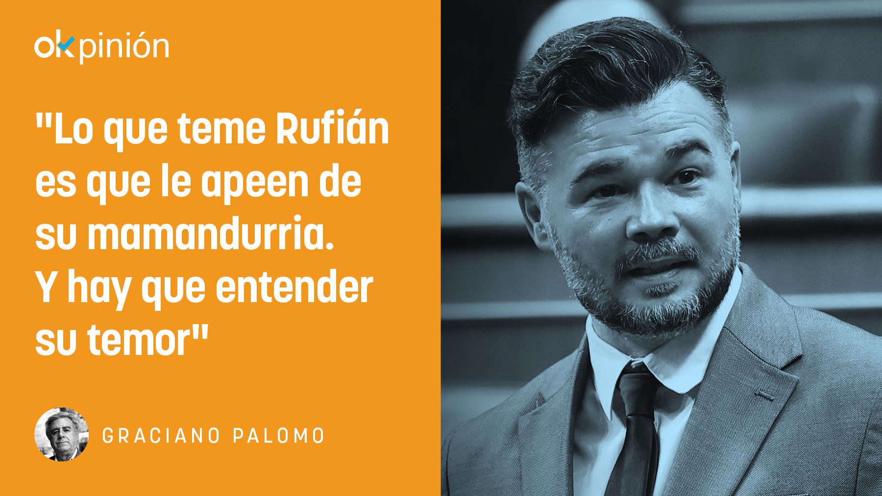 Lo que teme Rufián es que le apeen de su mamandurria. Y hay que entender su temor desde el punto de vista de la buchaca. ¿Dónde se va a ver en otra que por decir cuatro chorradas se lleve el pastizal que ganan ingenieros o físicos después de 20 años de trabajo? ¿Dónde le darán más por menos?