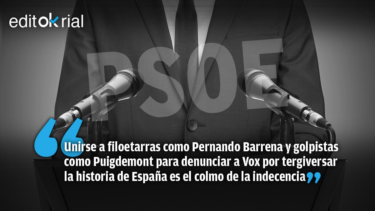 En el colmo de la indignidad, el PSOE ha firmado una carta en el Parlamento Europeo con el eurodiputado filoetarra Pernando Barrena y el golpista Carles Puigdemont, amén de otros radicales, para instar al presidente de la Eurocámara, David Sassoli, a que reprenda a Herman Tertsch (Vox) por cuestionar la historia de España. Es sencillamente indecente que los socialistas unan su firma a los enemigos declarados de España para que amoneste a un europarlamentario de la formación de Santiago Abascal por tergiversar nuestra historia, cuando los mayores tergiversadores y manipuladores de lo que es y representa España son los proetarras y los golpistas catalanes. Barrena es un político filoetarra que en 2016 reconoció su vinculación con la banda asesina ETA para reducir su condena a menos de dos años de prisión y no tener que entrar en la cárcel. Puigdemont, de todos conocido, es un prófugo de la justicia que promovió un golpe para subvertir el orden constitucional. Esos son los compañeros de viaje del PSOE, un partido que se ha echado definitivamente al monte y mantiene una alianza estratégica con las formaciones más execrables políticamente del Parlamento.