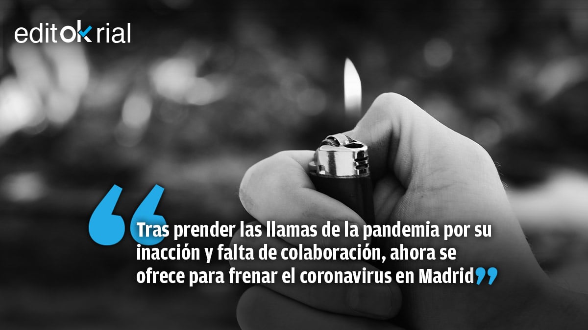 Es el bombero pirómano: su inacción y falta de colaboración prendió la mecha de la pandemia y ahora se presenta dispuesto a sofocar las llamas de la crisis sanitaria. Es tan burdo el plan que apesta: el jefe del Ejecutivo se ofrece como solución cuando durante toda la pandemia ha sido un problema. Mientras, agita el espantajo de la revuelta social con el inestimable apoyo de Podemos, que trata de incendiar las calles valiéndose del falaz argumento de que los barrios obreros de la capital -donde el virus se extiende a mayor velocidad- han sido abandonados a su suerte por el Gobierno de la Comunidad Madrid. Detestable y sucia maniobra socialcomunista para rentabilizar rastreramente la pandemia y cobrarse la pieza que lleva persiguiendo durante meses: la cabeza política de Isabel Díaz Ayuso.