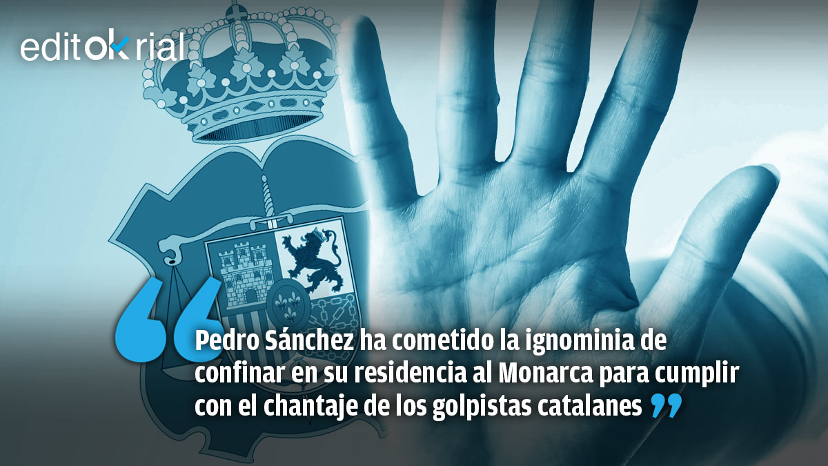 La propia Casa del Rey deja claro que si el jefe del Estado no estará en Barcelona será por decisión de Pedro Sánchez, que ha cometido la ignominia de confinar en su residencia al Monarca para cumplir con el chantaje de los golpistas catalanes. El Gobierno cercena así el papel institucional del Rey, convirtiéndole en moneda de cambio de las pretensiones separatistas. Nunca un Gobierno había llegado tan lejos al impedir que el jefe del Estado cumpla con su función de representación institucional.