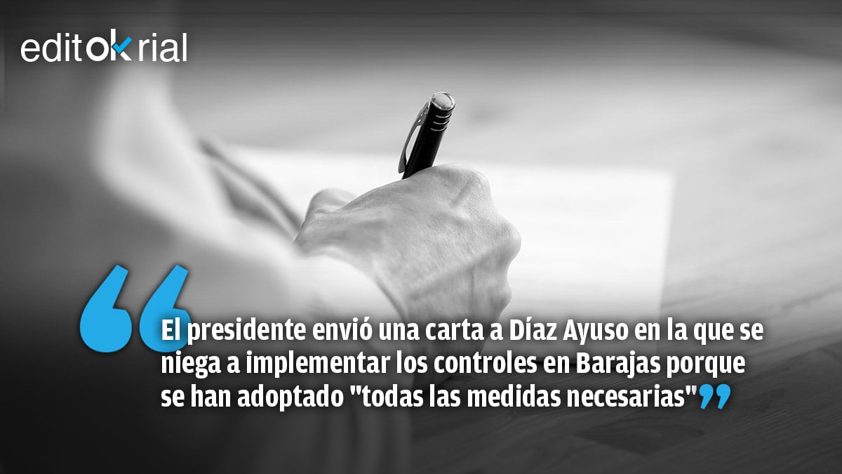 El Gobierno justificó su decisión de no implementar los controles en el aeropuerto de Barajas, entre ellos la realización de test PCR en el país de origen de los viajeros que acuden a España, en el hecho de que la presidenta de la Comunidad de Madrid le hizo la petición fuera de tiempo. No se sabe qué entiende Sánchez por fuera de tiempo, porque el presidente negó por carta las exigencias de Ayuso el 20 de junio, después de que la jefa del Gobierno regional de Madrid reclamara la realización de test PCR desde casi un mes antes. Desde el pasado 24 de mayo, Ayuso se lo pidió hasta en cuatro ocasiones.