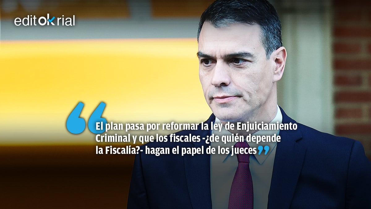 De lo que se trata, en suma, es de perpetuarse en el poder por la vía de un alianza con la izquierda radical y las fuerzas separatistas: un proyecto de dilución de las instituciones que pasa por romper el contrapeso judicial. Para su estrategia de ruptura del modelo del 78, los tribunales de Justicia suponen para Pedro Sánchez un problema. Hay cosas que le gustaría hacer al presidente del Gobierno que son inviables en un Estado de Derecho, de modo que lo que intentará el jefe del Ejecutivo es emprender un proceso de reforma de la Ley de Enjuiciamiento Criminal para que los fiscales -¿de quién depende la Fiscalía?- asuman la instrucción de los casos suplantando la función de los jueces.