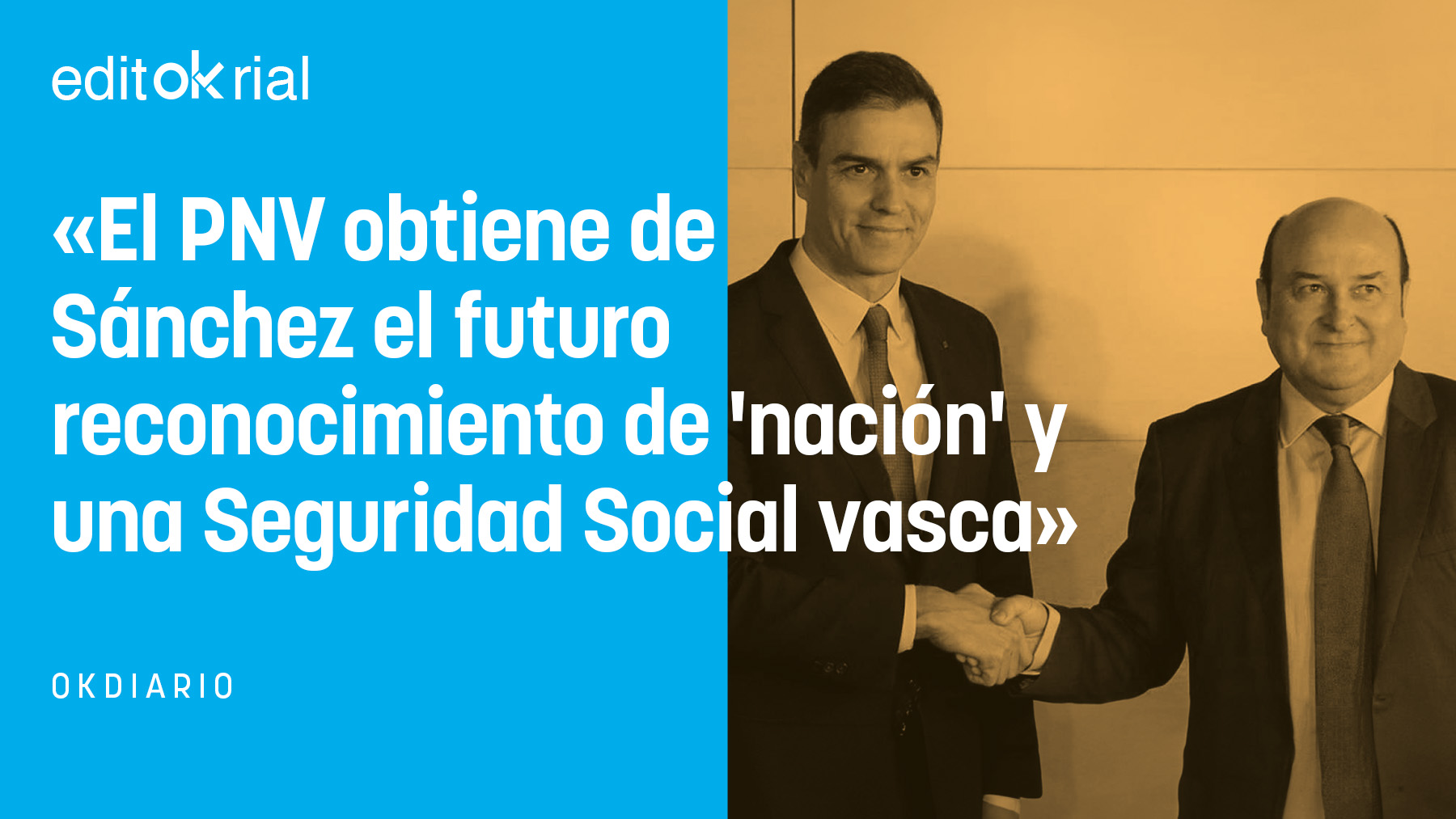 Aunque con menos trompetería, el acuerdo entre el PNV y el PSOE ahonda el proceso de ruptura constitucional desatado tras el acuerdo con los separatistas catalanes. A la chita callando, los nacionalistas vascos han logrado de Sánchez iniciar el proceso para la ruptura de la caja única de la Seguridad Social -las futuras pensiones- y el apoyo a un nuevo Estatuto que incluya el «reconocimiento nacional» del País Vasco, además de una relación»bilateral». A cambio, Sánchez se garantiza los cinco votos del PNV, lo que le permitirá salir investido en una primera votación. La cuestión no es baladí, porque el pacto sienta las bases para que las cotizaciones sociales y las futuras pensiones dejen de ser idénticas en todo el territorio nacional por la vía de una Seguridad Social vasca. En términos identitarios, los cimientos del nuevo Estatuto -encallado desde hace años- se recogen en el preámbulo que el PNV pactó con Bildu ya en 2018. El texto, que fue rechazado entonces por el PSOE, defendía el «derecho a decidir» del País Vasco, además de la consideración de «Euskal Herria» como «nación» y una relación «confederal» con el resto de España. Aquella propuesta, que las formaciones llevaron a la Ponencia de Autogobierno del País Vasco, no prosperó, pero sirve para comprender el fondo del acuerdo suscrito ahora entre el PNV y Pedro Sánchez. El futuro Estatuto, según el PNV y Bildu, debería contemplar «la posibilidad de establecer relaciones con la Comunidad Foral de Navarra y con los territorios vascos radicados en el Estado francés», como parte de esa ficticia «Euskal Herria».