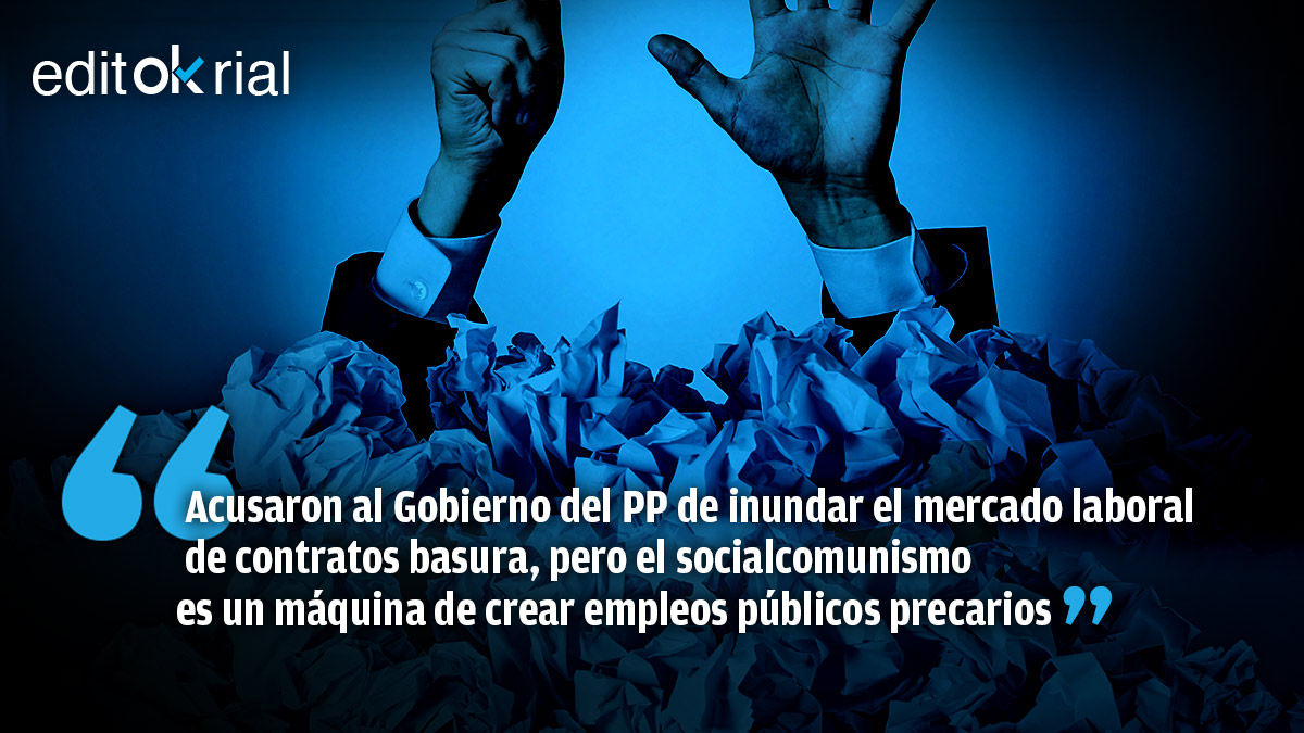 La hipocresía de la izquierda no conoce límites. Cuando gobernaba el PP le acusaron de promulgar una reforma laboral que primaba los «contratos basura» y ahora es el propio Ejecutivo quien ha degradado la calidad del empleo público a niveles nunca vistos. Ha sido llegar el socialcomunismo al poder e invadir de contratos precarios la Administración. Eso sí, los amiguetes y enchufados que crecen por doquier, de precarios nada.