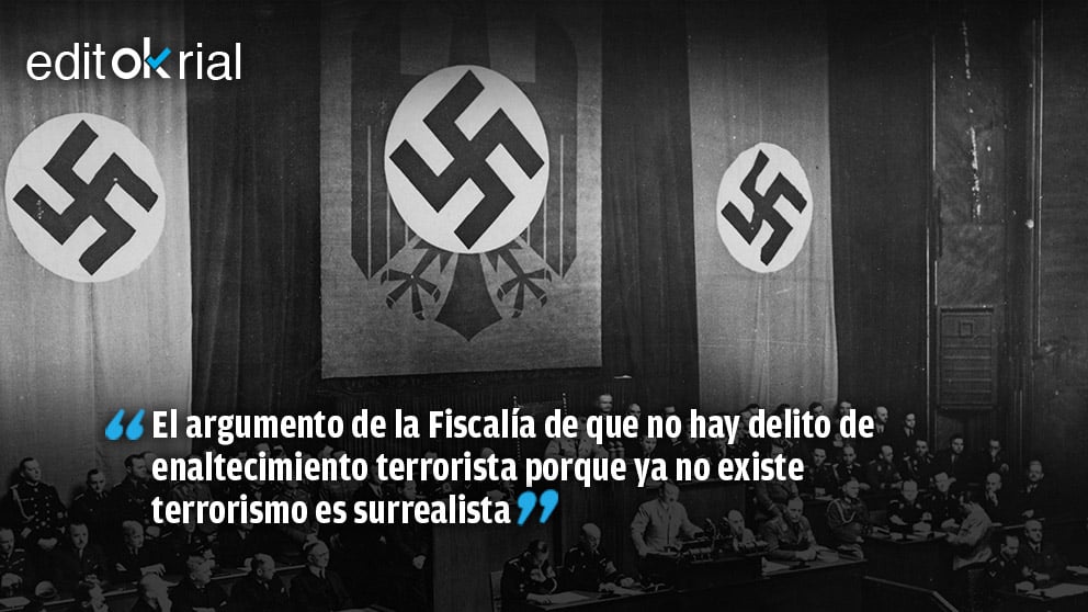 Eso de que extinguida ETA se extinga también el delito de enaltecimiento terrorista es un razonamiento absurdo, porque sería tanto como afirmar que muerto Hitler ya no existe el delito de enaltecimiento del nazismo. Con la tesis de la Fiscalía, el delito de enaltecimiento del terrorismo -aunque esté contemplado- deja de existir en el Código Penal. Da la sensación de que la Fiscalía baja las manos y acepta que la «nueva realidad social»sirva de coartada para que etarras con delitos de sangre sean homenajeados con total impunidad.