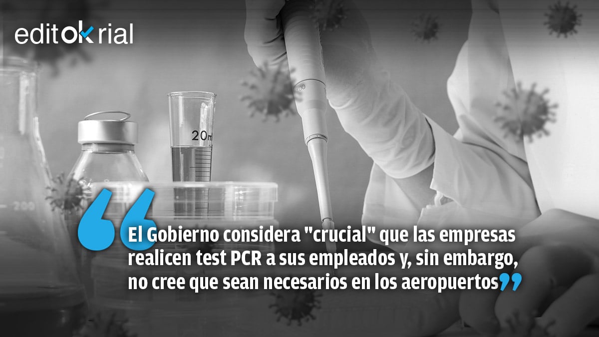 Lo que le exige el Gobierno a las empresas es, exactamente, lo que el Gobierno se niega a hacer en los aeropuertos. Y los argumentos para instar a las empresas a la realización de pruebas PCR a sus empleados son los contrarios a los que emplea el Gobierno para justificar su negativa a hacer test PCR en los aeropuertos. Dicho de otro modo: dice una cosa y la contraria y se queda tan ancho. Ya no se sabe si Salvador Illa desmiente a Pedro Sánchez, si Pedro Sánchez desmiente a Salvador Illa o los se desmienten mutuamente. Si miente uno o miente el otro. O los dos mienten.