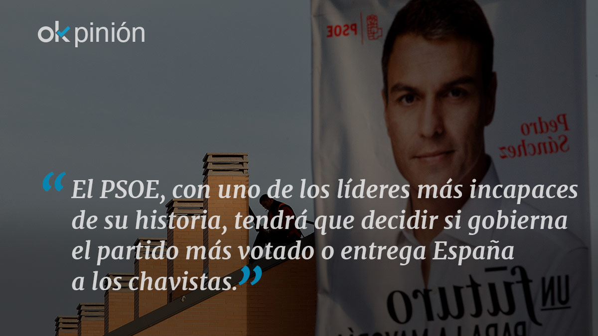 Así las cosas lo que parece evidente es que quien va a tener la clave de la gobernabilidad no va a ser Ciudadanos, por mucho que ellos quieran jugar ese papel, sino que la realidad es que será el PSOE, de la mano de uno de los líderes más incapaces de toda su historia, quien se va a ver convertido en un simple partido bisagra que tendrá que decidir si permite que gobierne el partido más votado o entrega España al comunismo chavista. ¿Tienen ustedes actualizado su pasaporte?