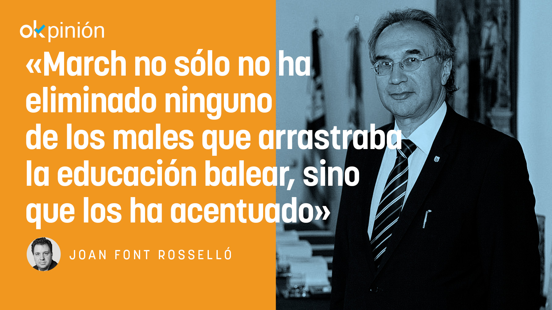 Con todo, desde mi punto de vista el peor reproche que hay que hacerle a March es que ni siquiera haya intentado frenar el trágico deterioro de no pocos «centros» de enseñanza, convertidos en una mezcla de guarderías y falansterios de convivencia en los que resulta complicado enseñar algo. La aceleración del deterioro de la enseñanza, me atrevería a decir irreversible, de la que son bien conscientes los docentes aunque les falte valentía para manifestarlo en público, amenaza con transformar el sentido y la propia esencia de la institución de la enseñanza tal como hasta ahora la hemos entendido. Desde mi punto de vista, este es de lejos el principal problema al que se enfrenta la educación en Baleares. Es cierto que la degradación de la educación viene arrastrándose desde antes de la llegada de March, pero no es menos cierto que en estos ocho años la principal obligación de March era tratar frenarla por todos los medios. Y no lo ha hecho.
