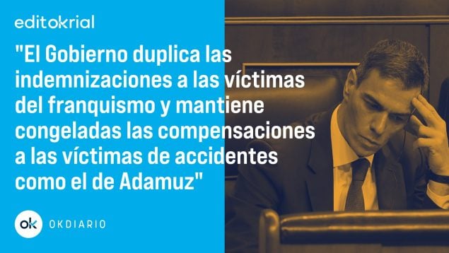 El Ejecutivo también aumenta el montante por incapacidad, pasando de 90.191 euros a 180.000 por «incapacidad permanente absoluta» y de 135.286,50 euros hasta los 500.000 euros por «gran incapacidad». Los afectados que ya percibieran una indemnización en base a la anterior normativa de 2007 podrán solicitar que se les abone la diferencia. El Gobierno lo justifica con el argumento de que «la sociedad española tiene un deber de memoria con las personas que fueron perseguidas, encarceladas, torturadas e incluso perdieron sus bienes y hasta su propia vida en defensa de la democracia y la libertad». Pues si el Gobierno se arroga el imponer a la sociedad española un «deber de memoria» que pregunte a la sociedad española si le parece lógico que las familias de los fallecidos en el accidente de Adamuz sean víctimas de peor condición. Aquí se actualizan las indemnizaciones no con criterios objetivos, sino con criterios absolutamente sectarios. Y es que para el Gobierno de Pedro Sánchez una víctima del franquismo merece más ayudas del Estado que las víctimas de un accidente de un tren o de una DANA.