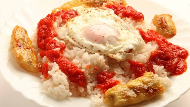 - Coloca una base de arroz, añade la salsa de tomate por encima y termina con el huevo. El plátano al lado.