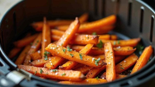 Principalmente por comodidad. Y por el resultado. La freidora de aire permite cocinar sin apenas aceite, pero consiguiendo una textura bastante parecida a la fritura tradicional. En el caso de la batata, eso se nota mucho. Bien hecha, queda dorada por fuera y tierna por dentro, sin quedar blanda ni aguada.