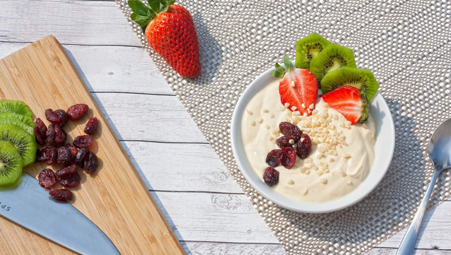 - En el vaso de una licuadora agregamos la mitad del yogur y el queso de cabra. Mezclamos hasta obtener una textura cremosa y reservamos.