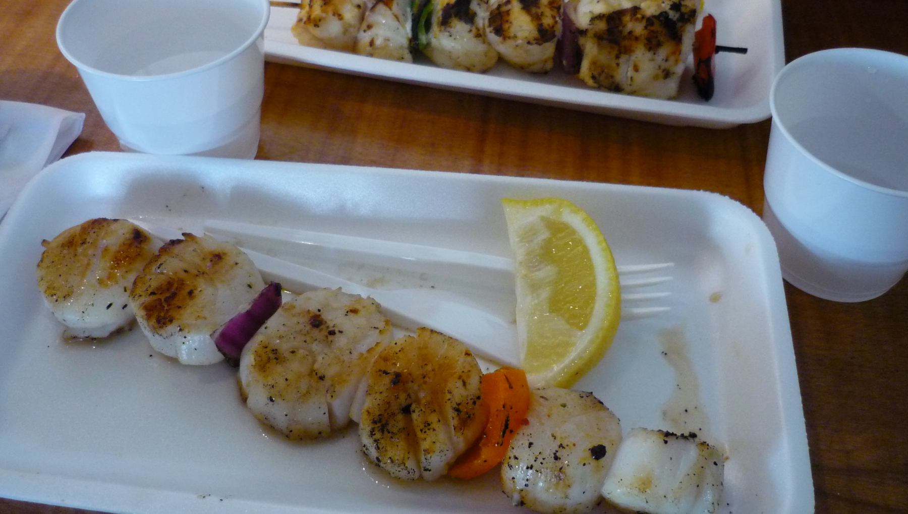 - Sacar las chalotas de la sartén, cortar e introducir una vieira en cada una, sujetándolas con una brocheta.