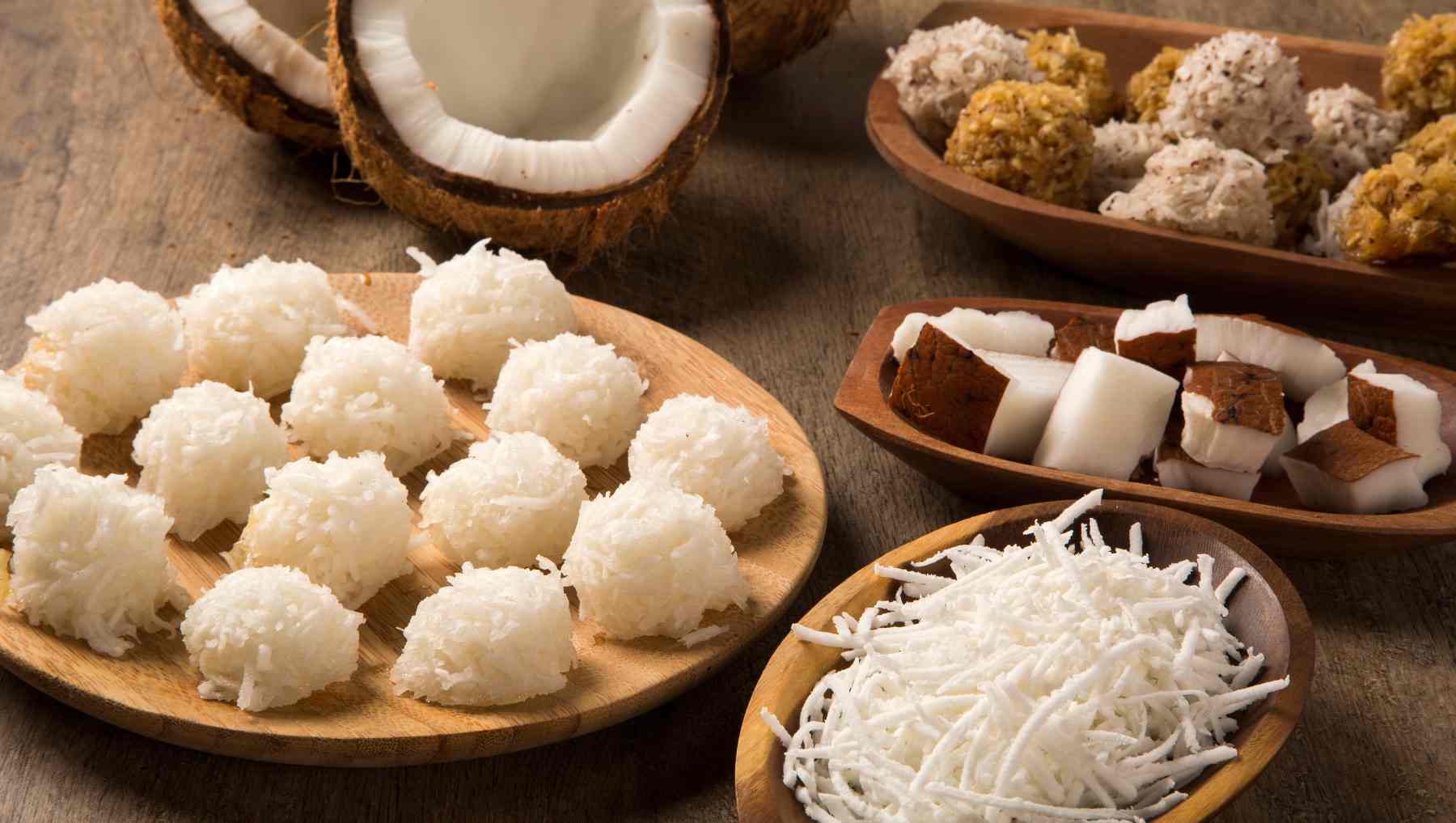 - Mezcla coco rallado con azúcar y leche. Cocina a fuego medio hasta que la mezcla espese. Forma pequeñas porciones y deja enfriar.