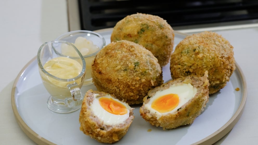 - Cubrimos los huevos con esta masa y los pasamos por el huevo batido y el pan rallado. Tendremos lista la base de unos maravillosos huevos dorados.