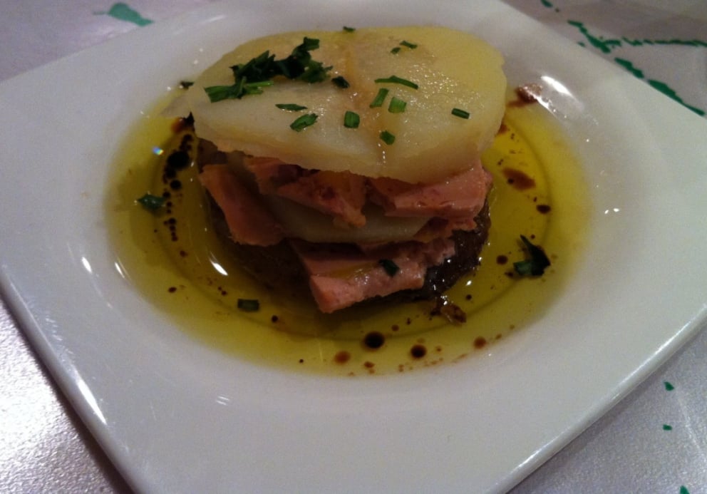 Las milhojas de patata, manzana y foie son un aperitivo que mezcla tres ingredientes de sabor contrastante: la patata hervida y asada, la manzana asada con mantequilla y azúcar moreno y el foie gras. Es un entrante delicado y exquisito ideal para una reunión gastronómica. Las milhojas de patata, manzana y foie se sirven de manera individual para obtener una bonita presentación y para que cada comensal se sienta especialmente atendido.