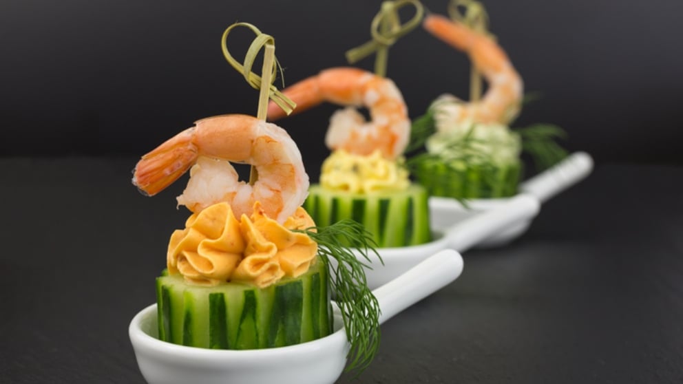 - Colocamos la mezcla en los moldes. Vamos a cocinarlos a 180º durante 20 minutos en el horno, hasta que el huevo haya cuajado. Serviremos con un langostino encima y un poco de aguacate de decoración. Tendremos listo un entrante de restaurante impresionante.