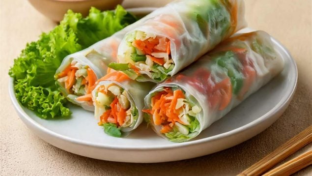 Rollitos asiáticos vegetarianos con salsa de cacahuete