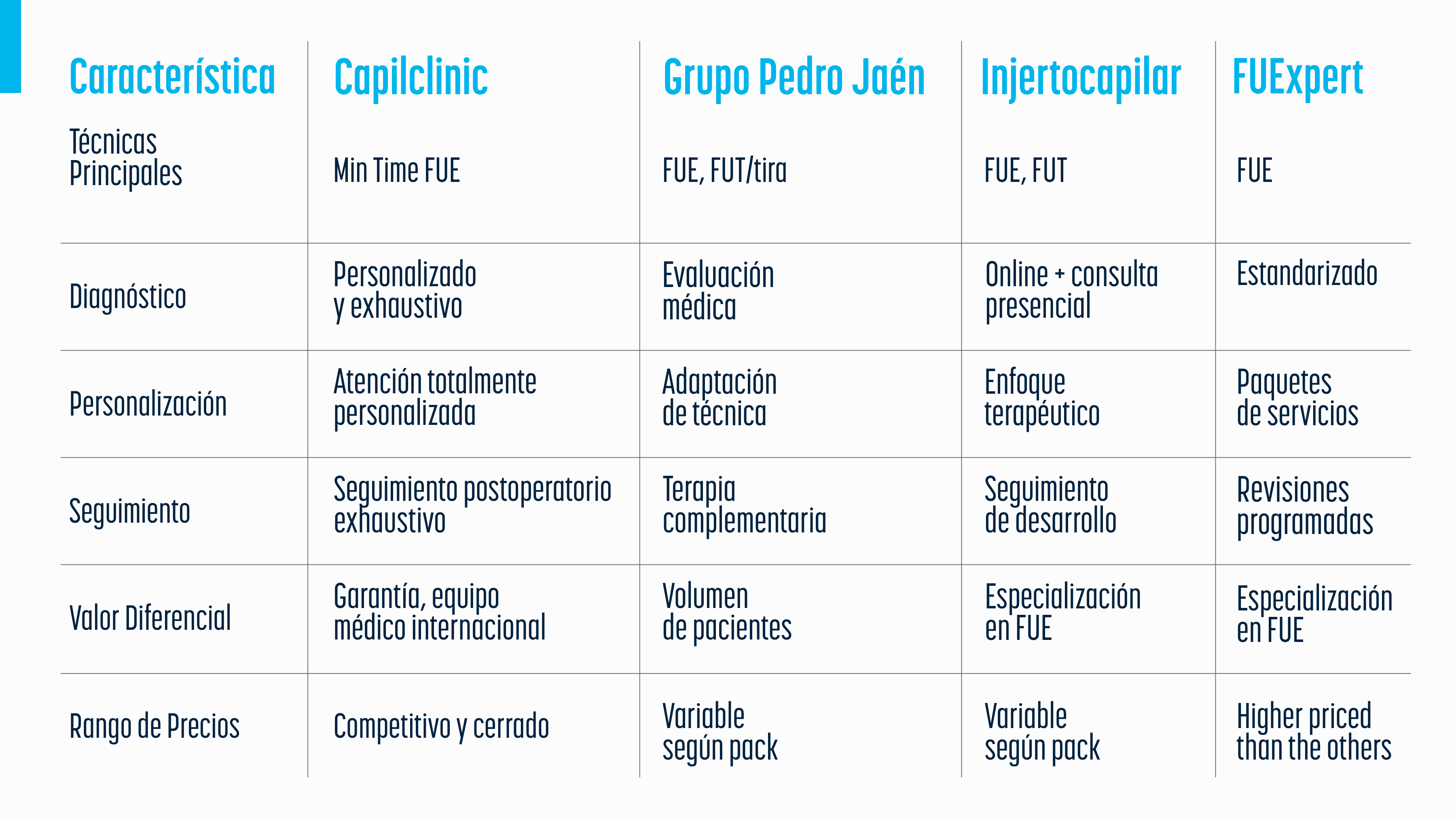 Para facilitar su decisión, hemos elaborado una tabla comparativa que resume los atributos clave de centros reconocidos como Capilclinic, Grupo Pedro Jaén, Injertocapilar y FUExpert.