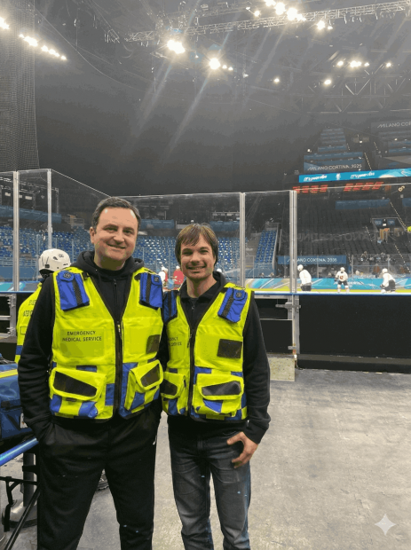 Tal y como deseaban, les han designado para las dos sedes de hockey sobre hielo que va a haber en Milán, para masculino, femenino y deporte paralímpico: “Los turnos de trabajo son bastante largos porque un requerimiento del Comité Olímpico Internacional es que los servicios médicos, lo que ellos llaman ‘Medical Station’, estén disponibles desde tres horas antes del primer entrenamiento hasta dos horas después del último partido”, señala el doctor.
