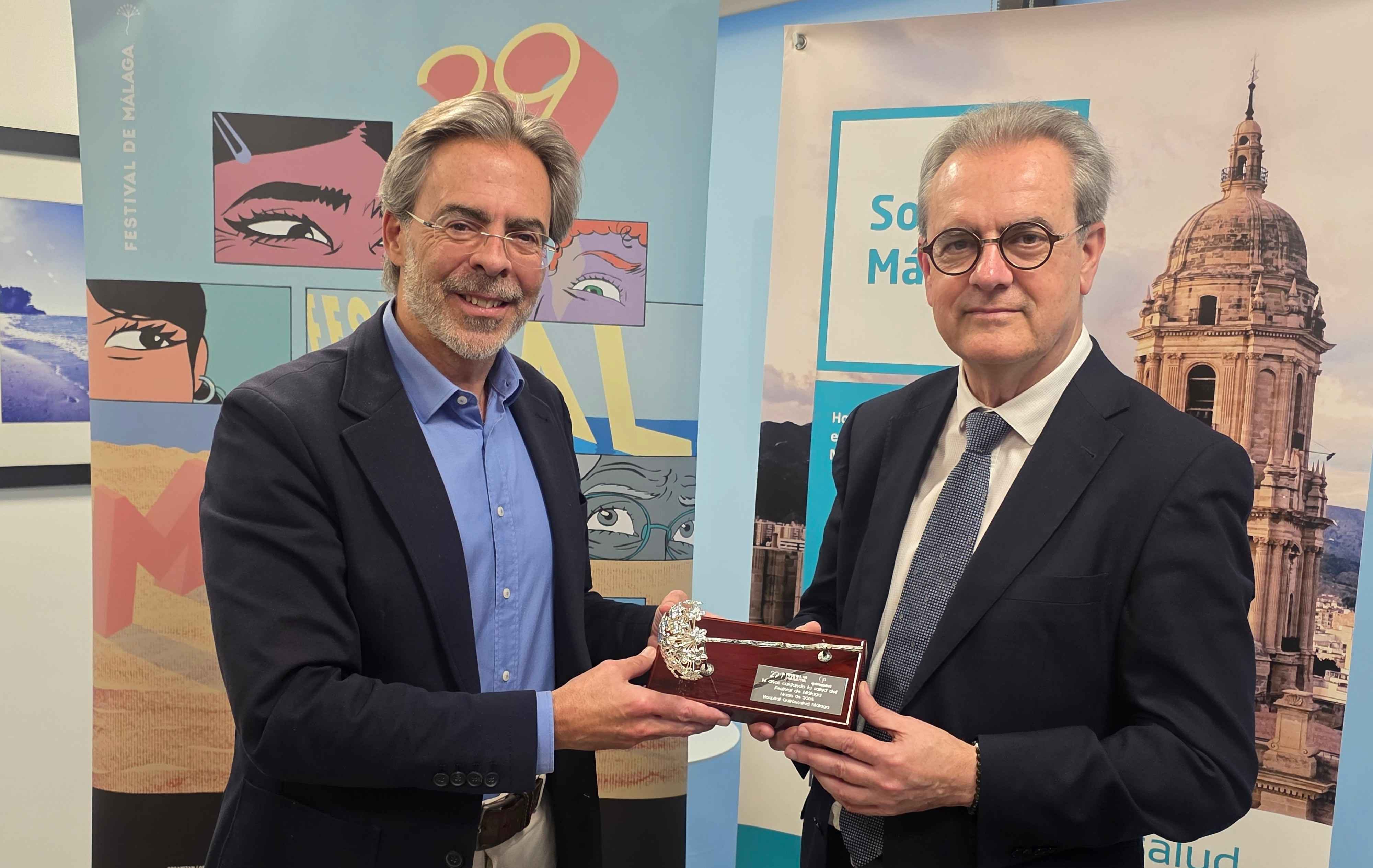 El director del Festival, Juan Antonio Vigar, y el director gerente del Hospital Quirónsalud Málaga, el doctor Tomás Urda, se entregan mutuamente una placa en reconocimiento a los años de acuerdo entre ambas instituciones.