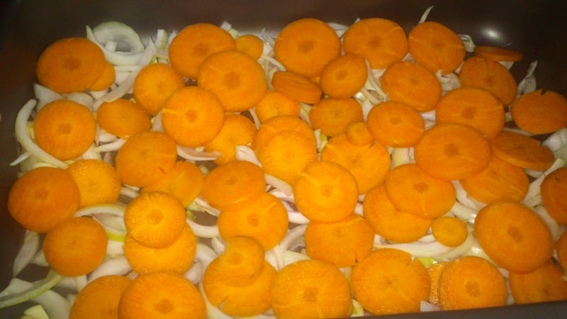 El proceso de elaboración es muy sencillo y sólo te llevará unos minutos. Lavamos bien las hortalizas y las pelamos. Mientras tanto habrá que precalentar el horno a 190 grados con calor tanto arriba como abajo. Las cebollas las partiremos en cuartos, las patatas en trozos más bien pequeños y las zanahorias a la mitad de manera longitudinal. Al cortarlas de esta manera conseguiremos que todas las verduras se asen al mismo tiempo. Con 45 minutos será suficiente para que nos queden bien hechas. El resultado será unas hortalizas tiernas por dentro y crujientes por fuera.