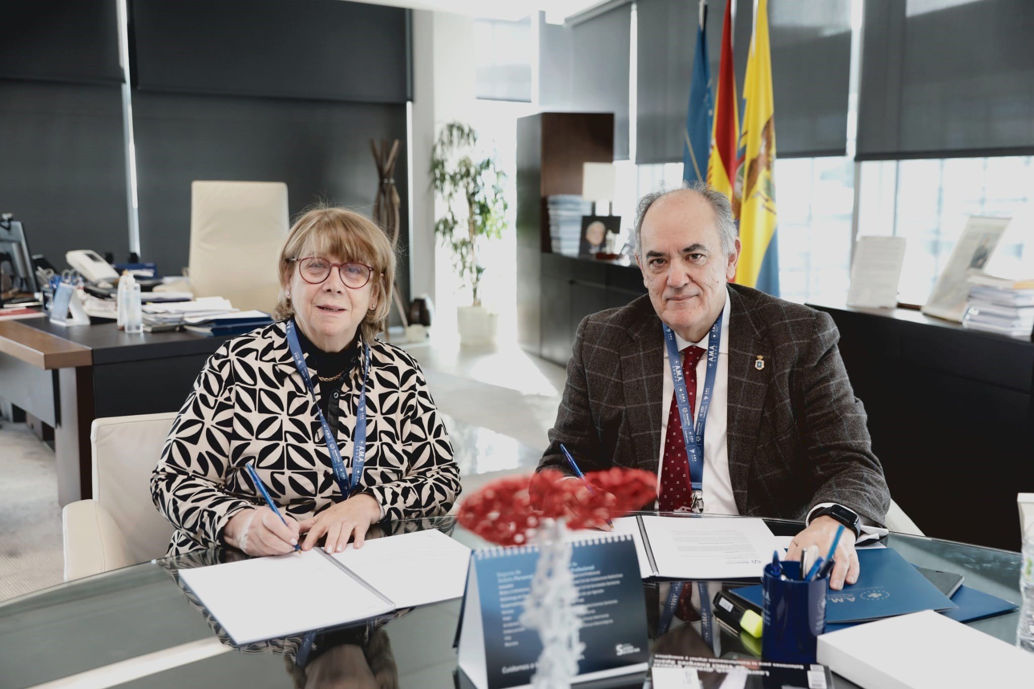 A.M.A. Grupo y el Colegio de Médicos de Ávila han firmado la nueva póliza colectiva de Vida que proporciona cobertura a todos los colegiados de la institución. En el acto estuvieron presentes, por parte de A.M.A., su presidente Dr. Luis Campos y por parte del Colegio de Médicos de Ávila, la presidenta Dra. María Begoña Sahagún Salcedo.