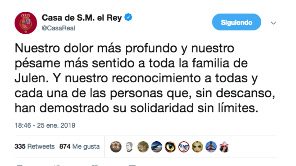 «Nuestro dolor más profundo y nuestro pésame más sentido a toda la familia de Julen. Y nuestro reconocimiento a todas y cada una de las personas que, sin descanso, han demostrado su solidaridad sin límites», refiere la Casa de S.M. el Rey en su cuenta oficial de Twitter.