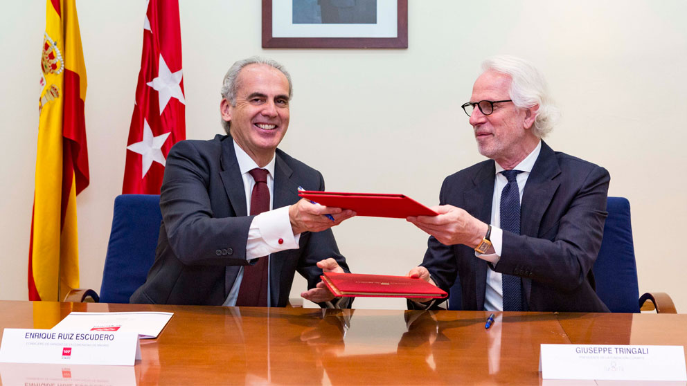 El Consejero de Sanidad de la Comunidad de Madrid, Enrique Ruiz Escudero; el Viceconsejero de Sanidad y Director General del Servicio Madrileño de Salud, Fernando Prados; y el Presidente de Fundación CurArte, Giuseppe Tringali, han firmado el convenio este miércoles en la sede de la Consejería de Sanidad.