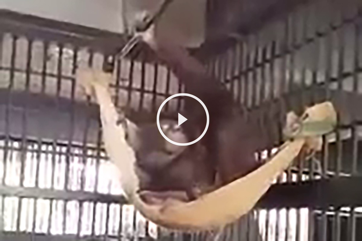 Cansado de dormir tantos días en el suelo, este orangután decide cortar por lo sano y se pone manos a la obra. Encuentra un trozo de tela y lo ata a los barrotes de su jaula. El resultado: muy confortable. Estos hechos confirman que los primates se parecen mucho a nosotros.