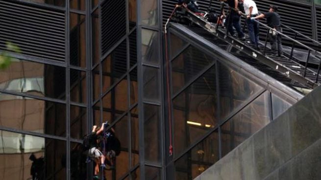 Según un testigo este individuo extrajo señales de su mochila para mostrárselas a los trabajadores el interior del edificio, y llegó a sacar un panel de dibujo electrónico, pero este objeto se le cayó al suelo. Varios helicópteros se reunieron en torno al escalador, que llevaba la vestimenta típica de la escalada de alto nivel en montañas.