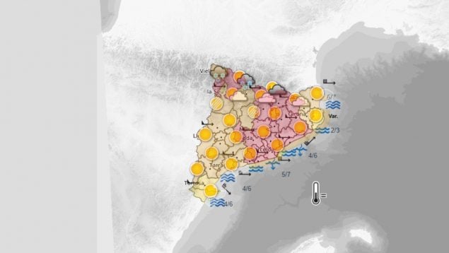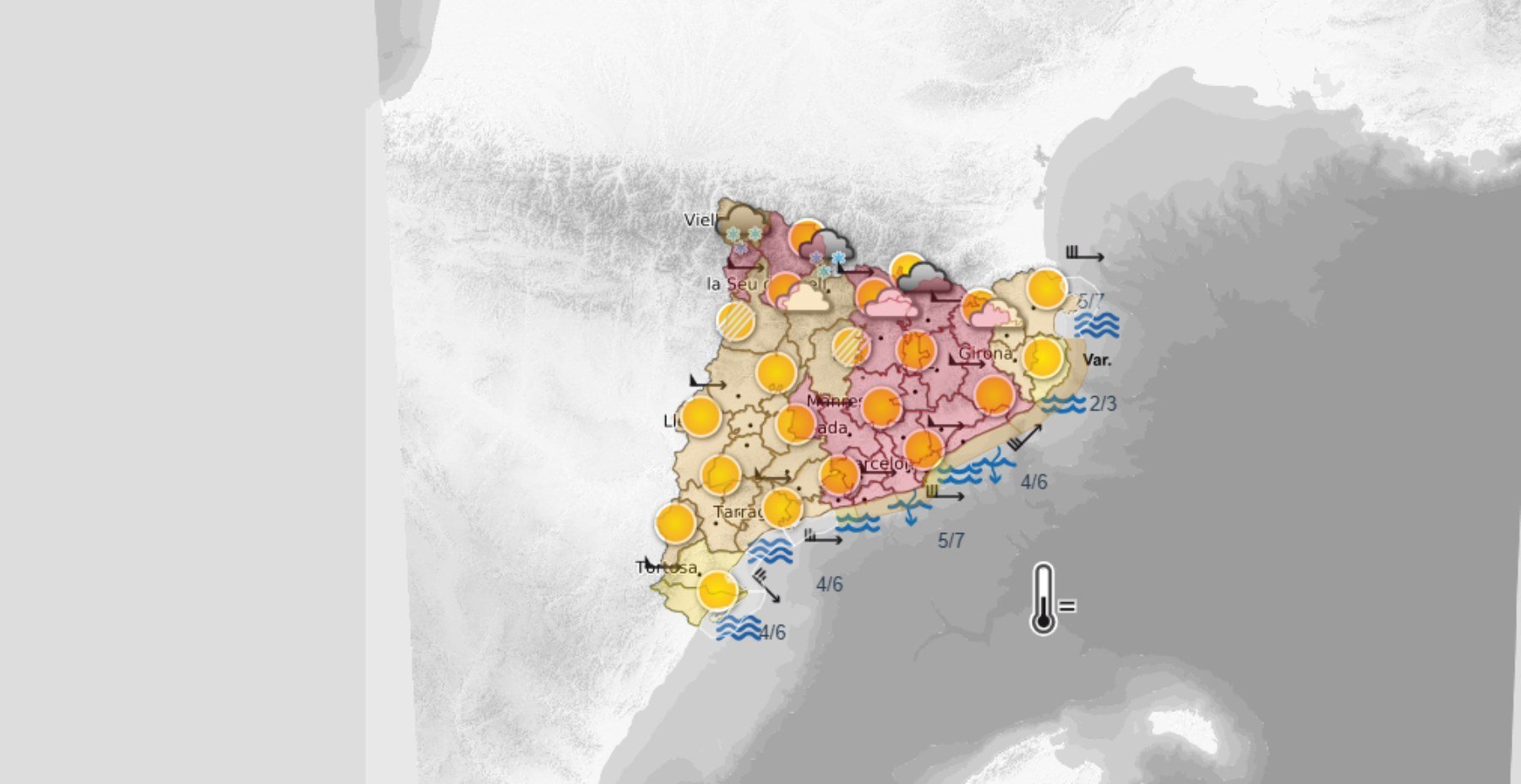 Tal y como nos explican desde la AEMET: «Intervalos nubosos en Pirineos, donde se esperan precipitaciones débiles en la divisoria y valle de Arán; en el resto, cielo poco nuboso. Cota de nieve en torno a los 1000-1400 m. Temperaturas en descenso, ligero o sin cambios en el litoral de Girona. Heladas débiles en puntos del Pirineo. Viento moderado de componente oeste, ocasionalmente fuerte y con rachas muy fuertes, tendiendo a amainar al final del día». Siguiendo con la misma previsión: «Rachas muy fuertes de viento».