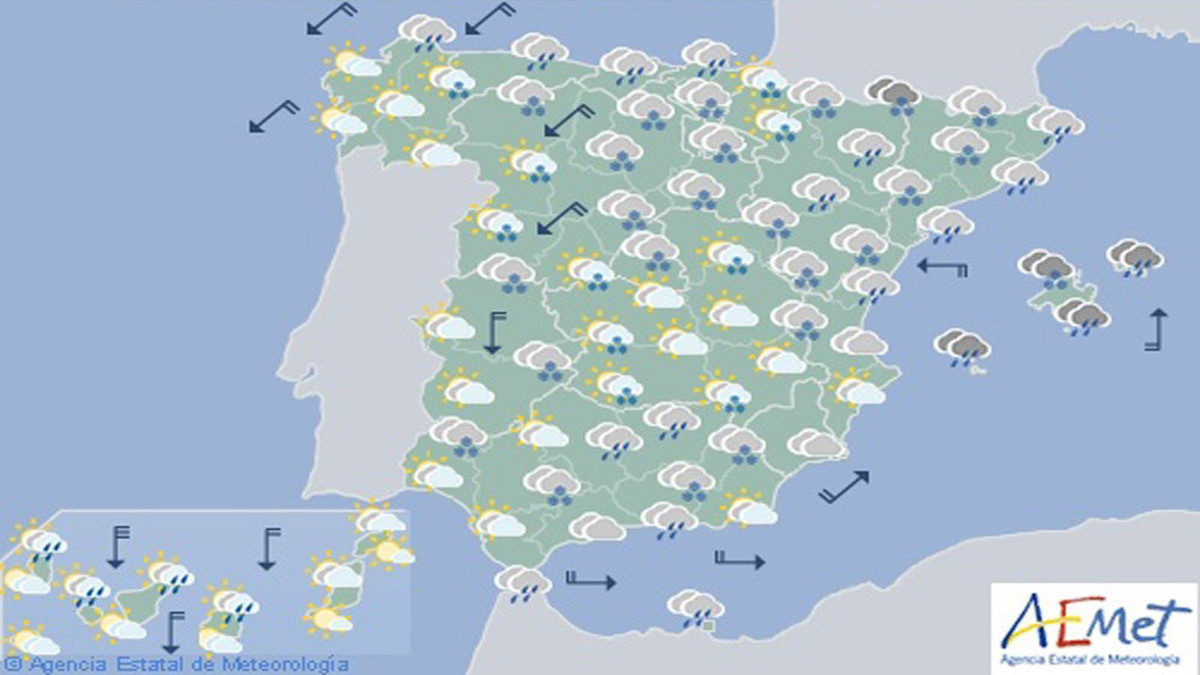 En el resto de la Península y área mediterránea, también se esperan precipitaciones con tormentas ocasionales, siendo menos probables en Extremadura y Andalucía occidental y litoral. En Canarias, probables lluvias en el norte de islas de más relieve.