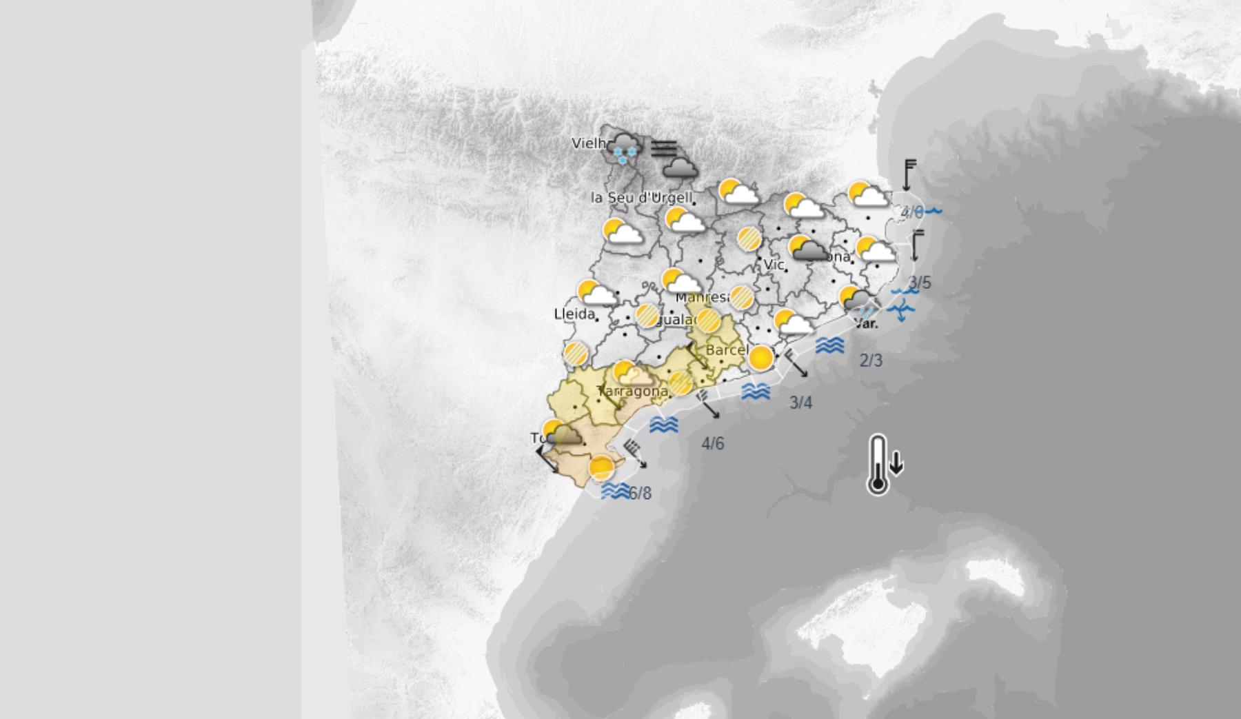 Tal y como nos explican los expertos de la AEMET: «Cielo nuboso en el Pirineo e intervalos nubosos en el resto. Se esperan precipitaciones en el Pirineo occidental, con cota de nieve descendiendo desde unos 1000-1200 m hasta unos 600-800 m al final del día, acumulándose espesores significativos de unos 10-15 cm en la vertiente norte a partir de los 1000 m. No se descartan chubascos dispersos en zonas del litoral norte, más probables por la mañana. Temperaturas en descenso, con heladas en el Pirineo. Viento del noroeste en el Ampurdán, el Pirineo y la mitad sur, de intensidad ocasionalmente fuerte y con rachas muy fuertes en el sur de Tarragona; en el resto se espera viento flojo con predominio de las componentes norte y oeste».