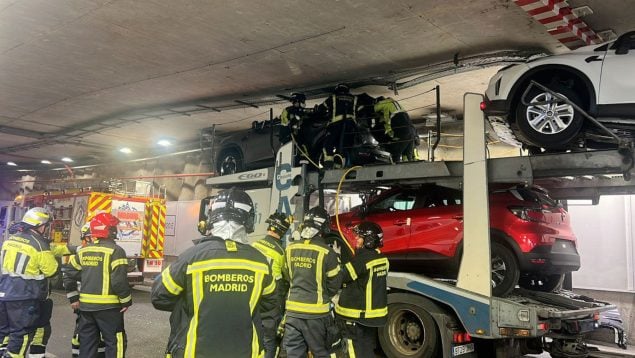 El camión ha quedado atrapado en un punto del túnel en el que el gálibo permitido es de 3,85 metros, una altura que superaba con creces por los coches que transportaba, según ha informado Emergencias Madrid.