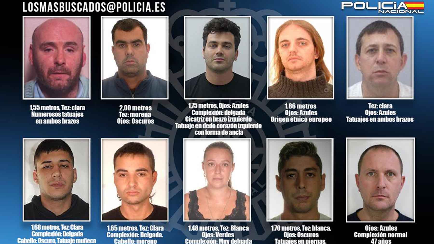 La Policía Nacional ha lanzado una campaña para localizar a diez fugitivos buscados por diferentes juzgados nacionales e internacionales. En la lista de los más buscados se han incluido prófugos con diferentes perfiles delictivos, algunos de ellos en busca y captura desde hace más de 15 años, y que podrían ocultarse en nuestro país. La colaboración ciudadana puede ser determinante para su localización, por lo que se ha habilitado una dirección de correo electrónico específica, [email protected] para que los ciudadanos que crean tener algún dato que pueda conducir a su localización lo comuniquen a los investigadores de forma confidencial. Además, cualquier información sobre su paradero puede ser comunicada a través del 091.